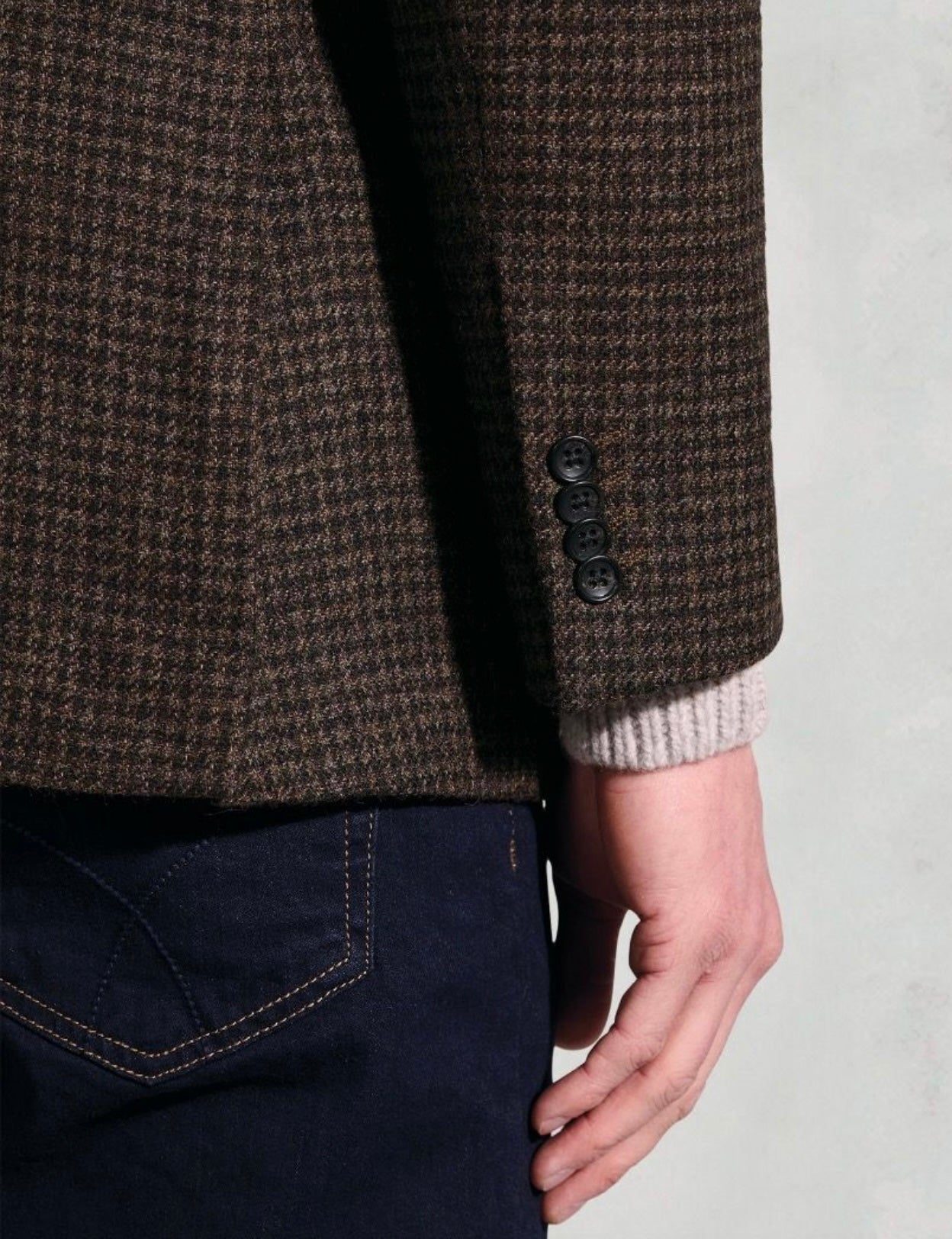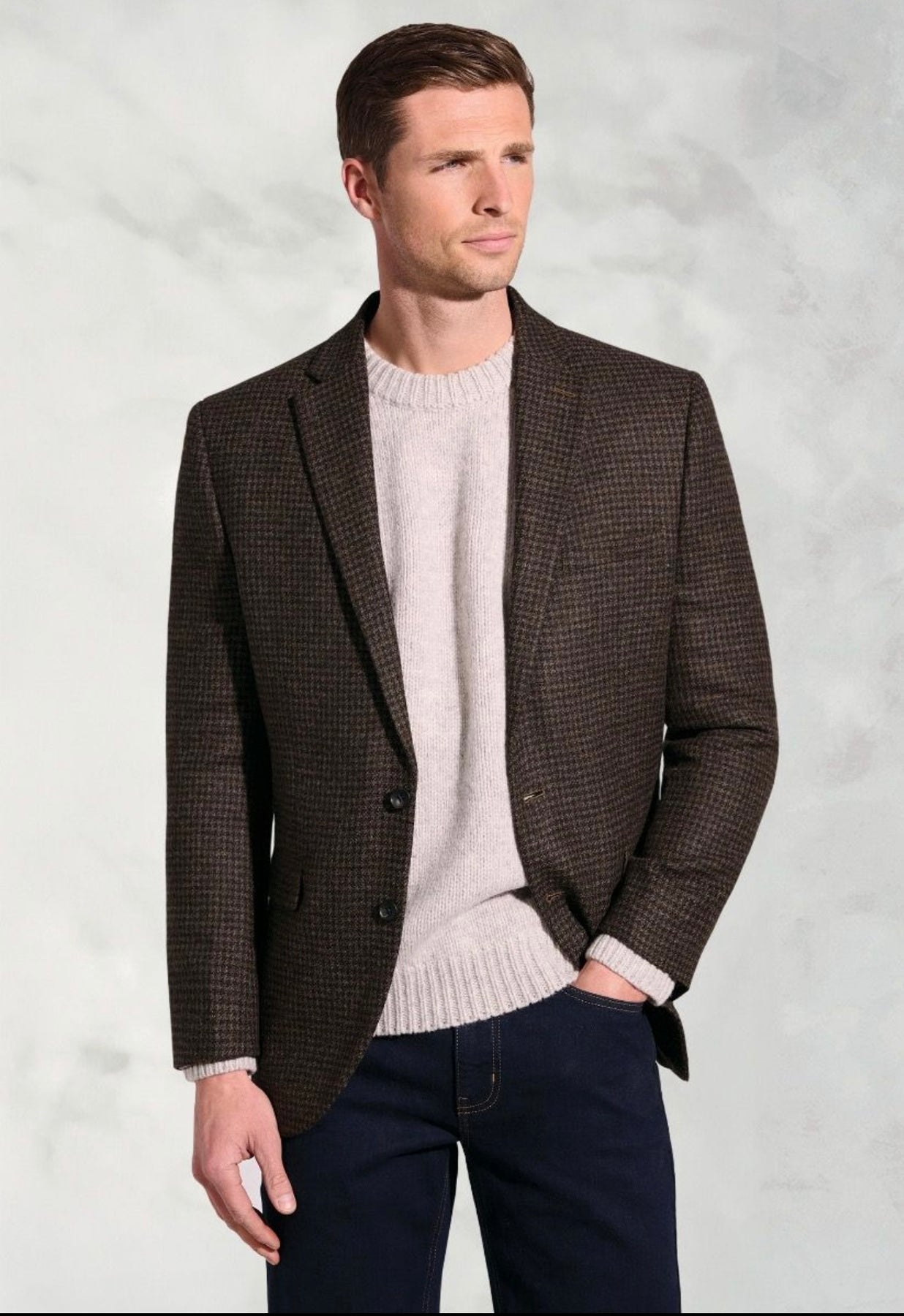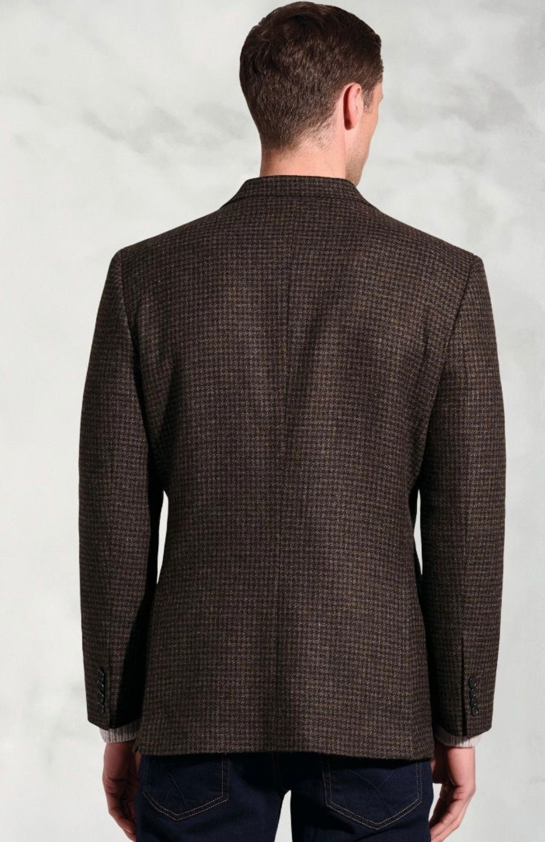 A classic country-style puppytooth in a deep brown tone, tailored for a sharp silhouette. Made in a breathable wool-cotton blend.